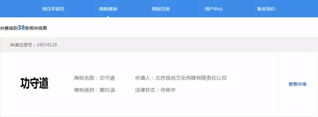 功守道的电影10月才拍,但是我们通过商标快注查询发现,“攻守道”商标的所有类别注册都是在6月7日、8日两天完成的,申请类别也达30多个,其中21、22、23、24、25、27类都注册了两次。可以看出电影运营方对商标的保护意识非常超前和全面,许多知产界人士都对该注册行为给予了高度的评价。