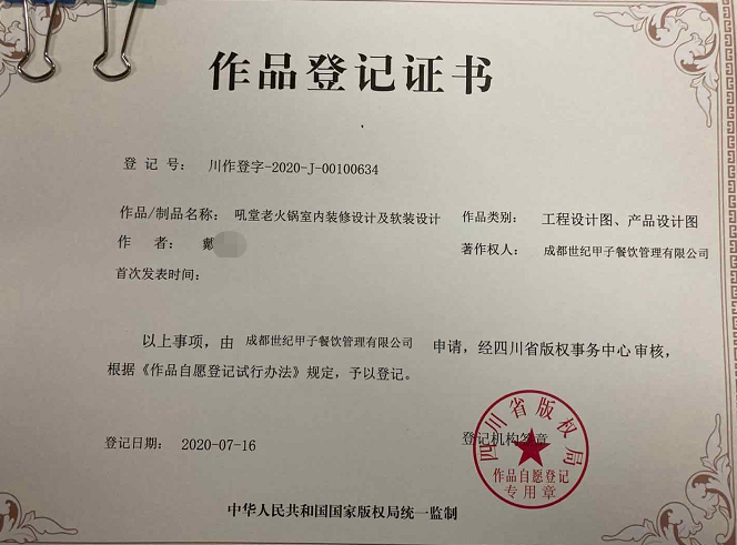 火锅店装修设计已获作品登记书